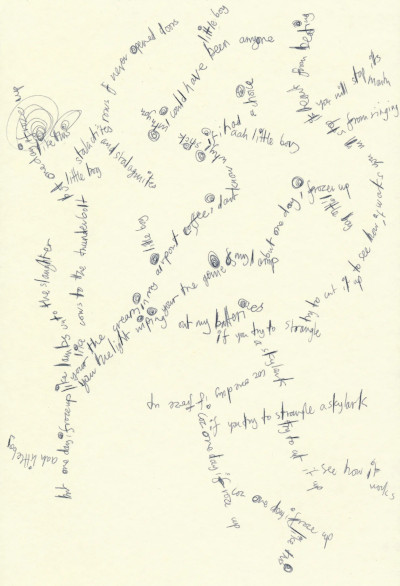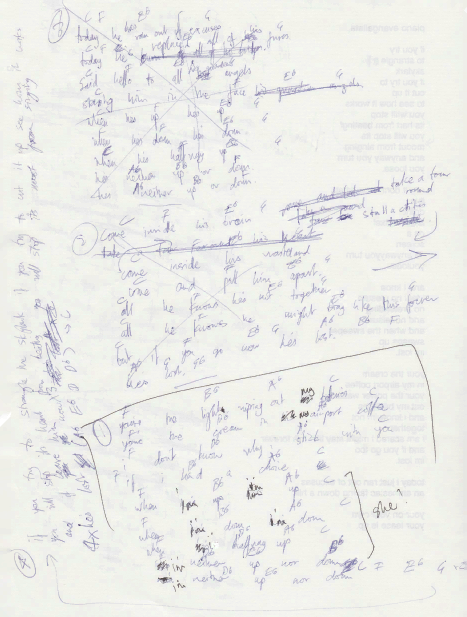 A page of lyrics for the song can be found in the Kid A Mnesia Exhibition's files. Faint text in the background suggests the track may have had a working title of "Piano Evangelists". A transcription appears below.