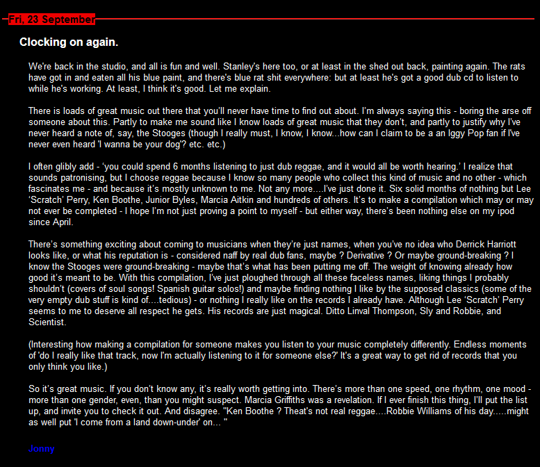 The band reconvened a few weeks after that session to continue working on new material. Two weeks, from september 19th to 30th, were spent in the band's own studio to sketch out arrangements and lyrics. Stanley joined them and started working on artwork that was used in the official Radiohead calendar for 2006.
